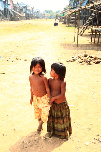 雨季になると水没するコンポン・プルック村の道に立つ「なかよしふたり」