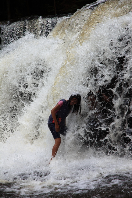 高さ数メートルはある小滝のシャワーに着衣のまま、どっぷりと打たれる姿はカンボジア流!?