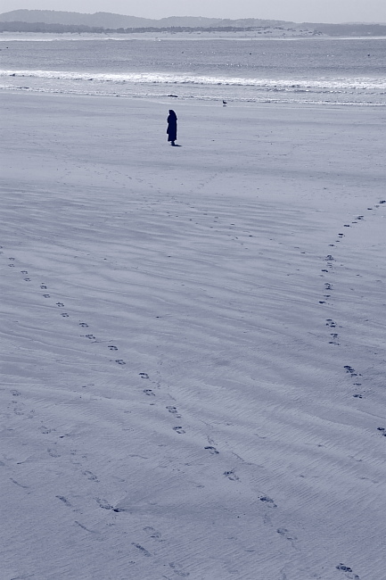 マグレブの西の果て、大西洋に面した砂浜をジュラバを着た人がゆく、ちょっぴり異国の匂いが漂うショット。