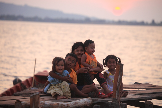 桟橋から夕日をバックに笑顔の子どもたち / Koh Kong, CAMBODIA