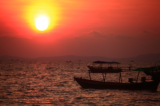 カンボジアの海に沈む真っ赤な太陽を見つめ、物思いにふけながら…。