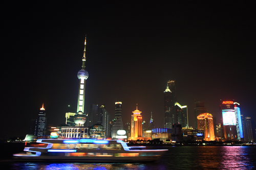 外灘(バンド)から見る浦東のビル群と黄浦江を行く水上バス。