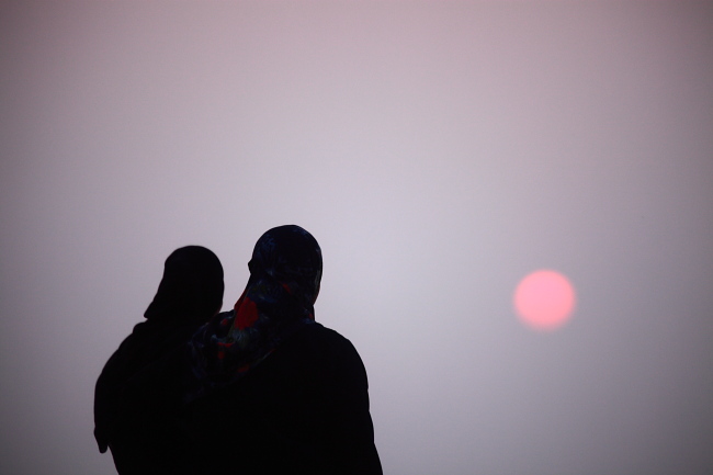 それらすべてを消し去るかのように美しく輝く色合いのサリーを身に纏った女性が歩きゆく姿。