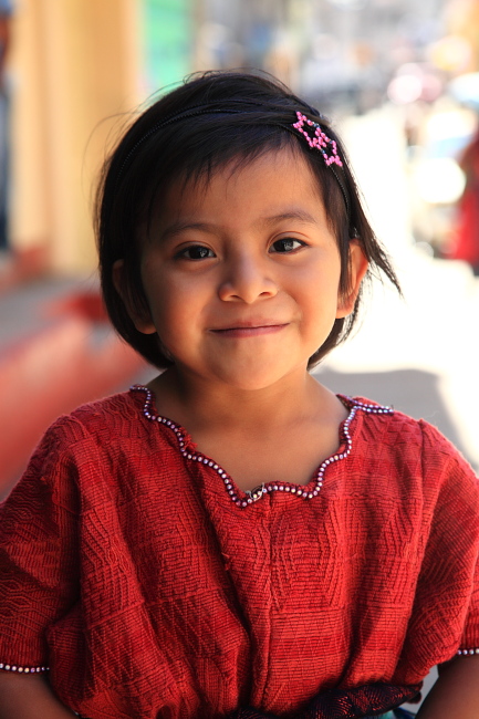土曜市に来ていた赤いウイピルが似合う女の子に、スペイン語で笑顔を意味する「Sonrisa」と声をかけて撮ったポートレート。