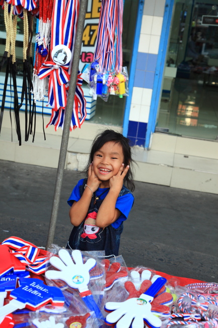チットロムの反政府デモ会場でお父さんと一緒にグッズ販売をしていた女の子。