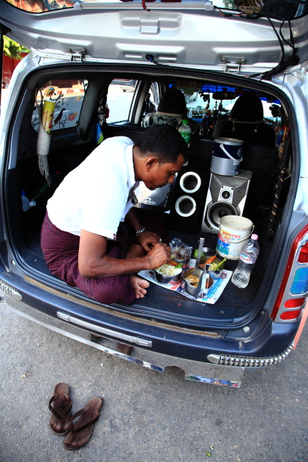 男は自らの愛車のラゲージ・スペースで弁当箱を広げ食していた。